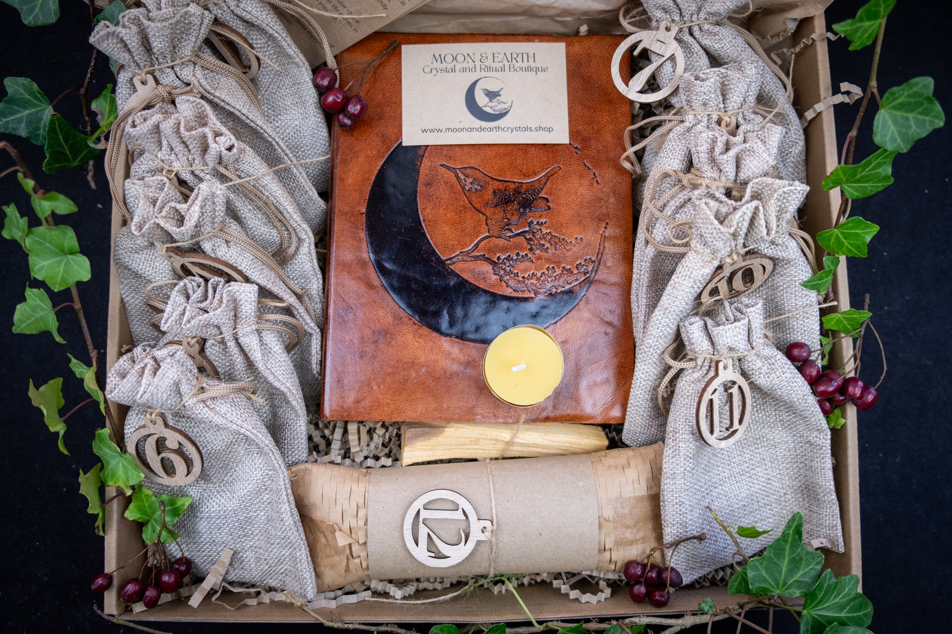This is more than an advent calendar. It is a gift to yourself: a chance to create space in the busyness of the season and reconnect with your inner journey. Alongside your 12 crystals, you’ll receive a vegetable-tanned Moon & Earth leather journal for capturing your insights, a stick of ethically sourced palo santo to clear your space and prepare for each reflection, and a hand-poured natural 'made in Devon' beeswax tealight to honour the light. Together, they form a complete ritual set.