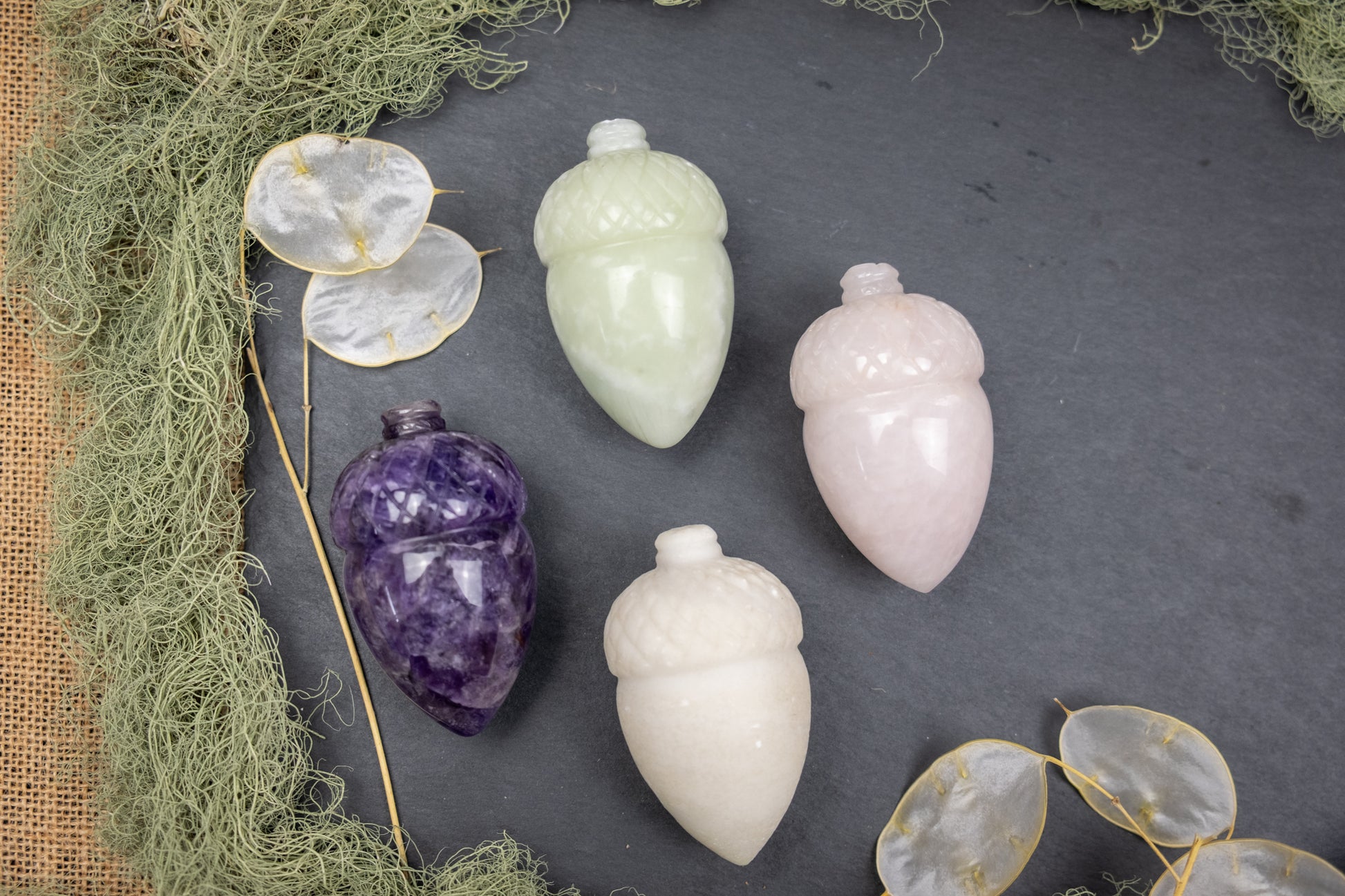 These acorn carvings are beautifully shaped with a smooth polished finish that highlights the natural colour and pattern of each crystal. The carved cap and rounded acorn form give them a wonderful tactile quality that makes them lovely to hold in the hand.