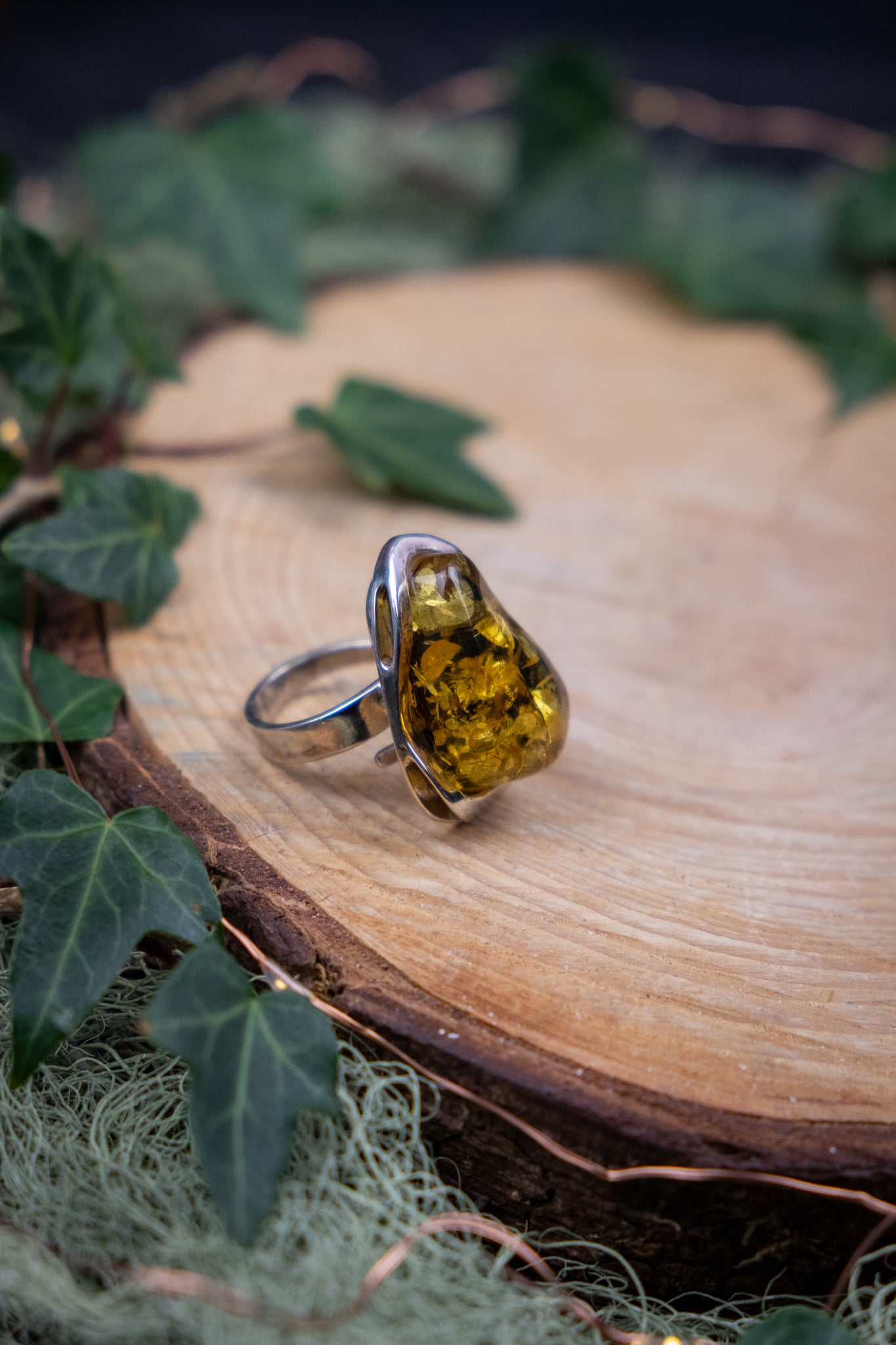 Baltic Amber adjustable sterling silver ring offering grounding, warmth and steady emotional support, ethically sourced from the Baltic region and ideal for daily anchoring and gentle vitality.