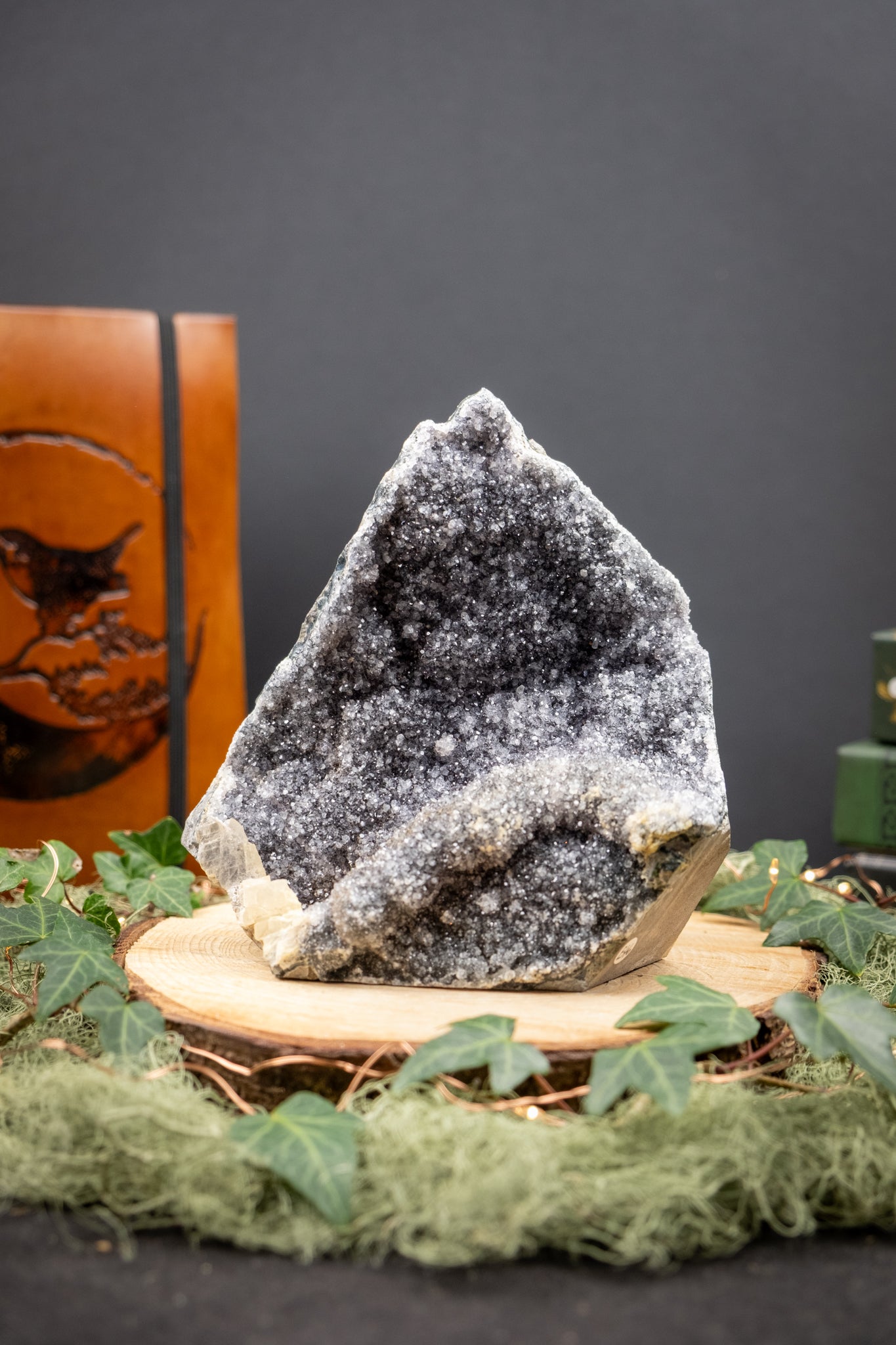 This black and silver drusy Amethyst cluster with a hand cut base is a powerful crystal for grounding calm and spiritual protection, ethically sourced from the mineral rich lands of Uruguay. This piece is ideal for those seeking emotional steadiness deeper rest and a strong yet gentle energetic presence within the home or healing space.