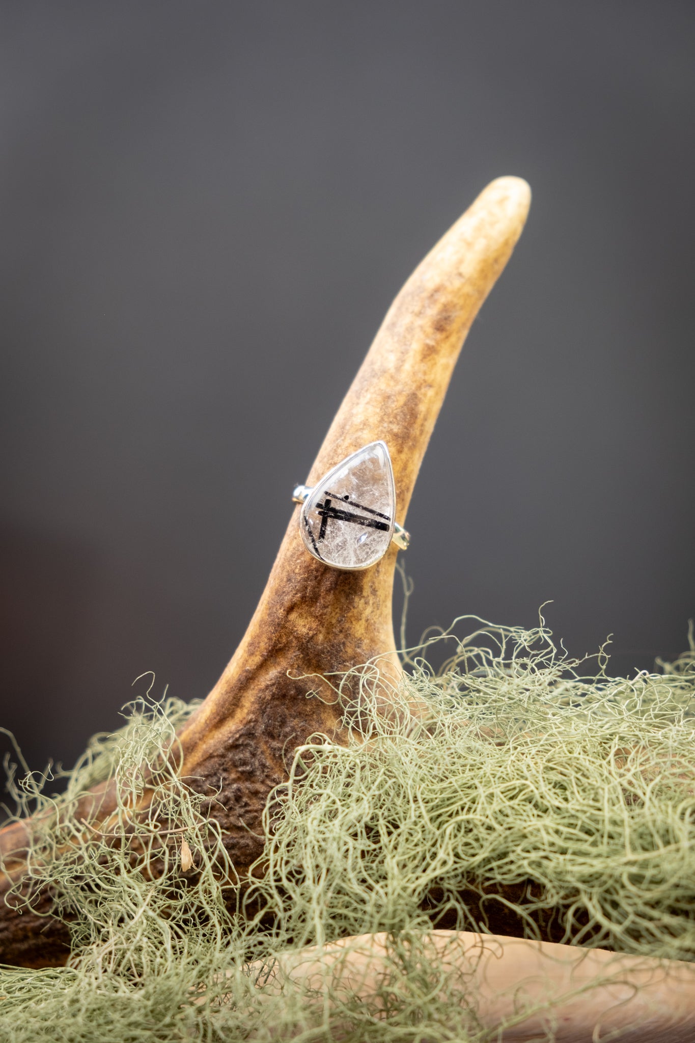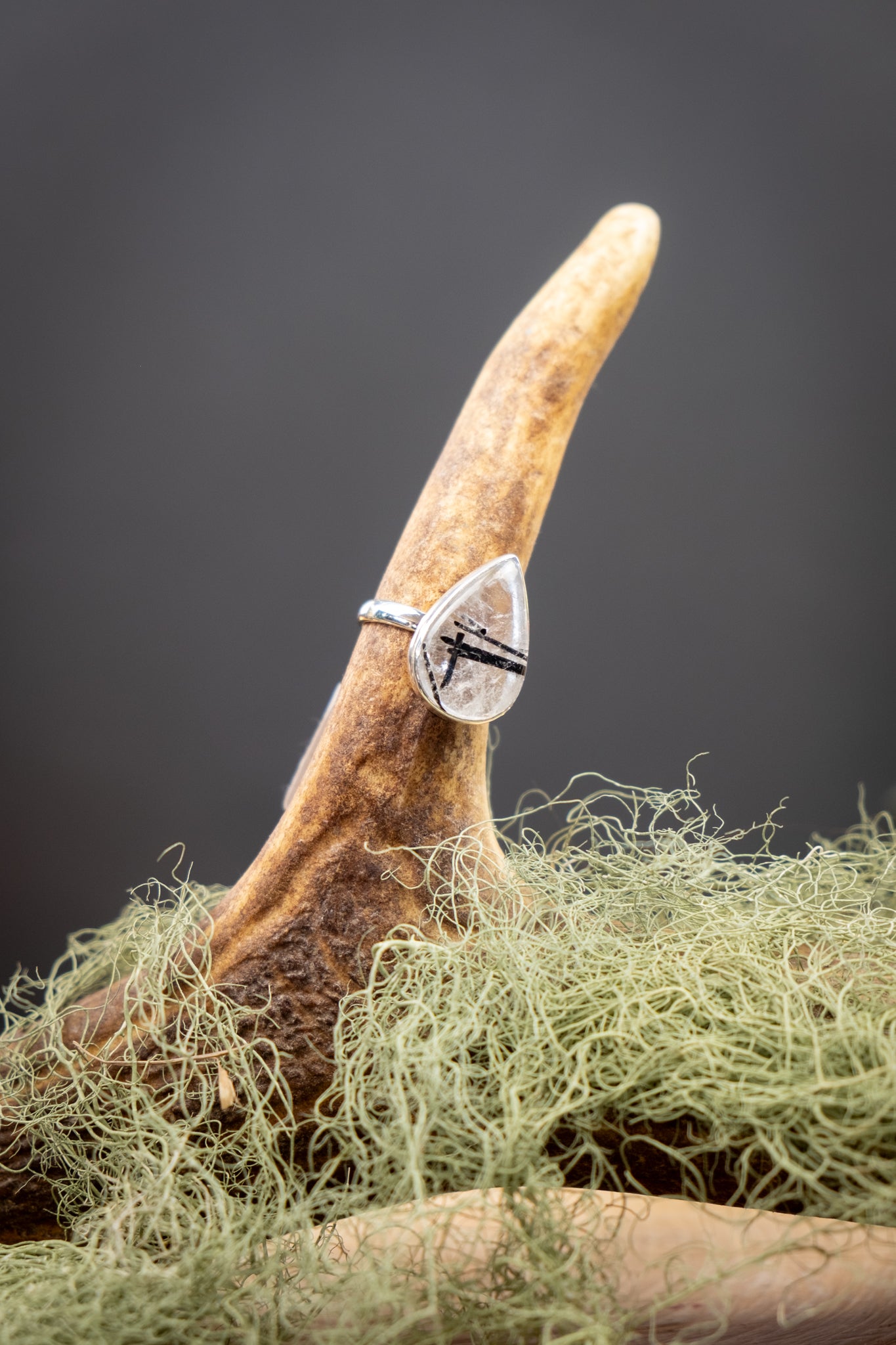 This one of a kind Black Tourmaline in Quartz ring is set in solid sterling silver and showcases the powerful beauty of tourmalinated quartz, where protective strands of Black Tourmaline are suspended in luminous, high clarity Quartz. This combination stone is loved for grounding the body, clearing stagnant energy, and bringing clarity in moments of stress. It is ideal for anyone seeking protection, energetic cleansing, or a strong sense of stability while staying open and connected to intuition.