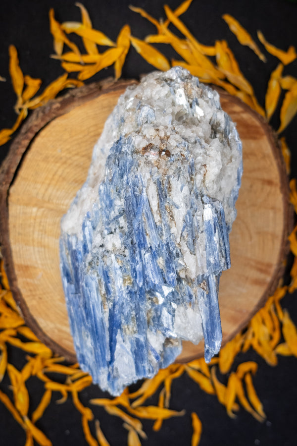 This striking Kyanite in Quartz specimen combines the powerful vibration of blue Kyanite with the amplifying qualities of Quartz, creating a crystal of clarity, alignment and energetic expansion. Kyanite is renowned for its high frequency energy, opening the channels of communication, clearing energetic blockages and restoring flow. Quartz amplifies these properties, magnifying the stone’s spiritual and healing resonance. Together, they create a talisman for spiritual connection, higher awareness and deep energetic cleansing. This piece was ethically sourced from the mineral-rich lands of Brazil, a region celebrated for its high quality Kyanite formations and luminous Quartz.