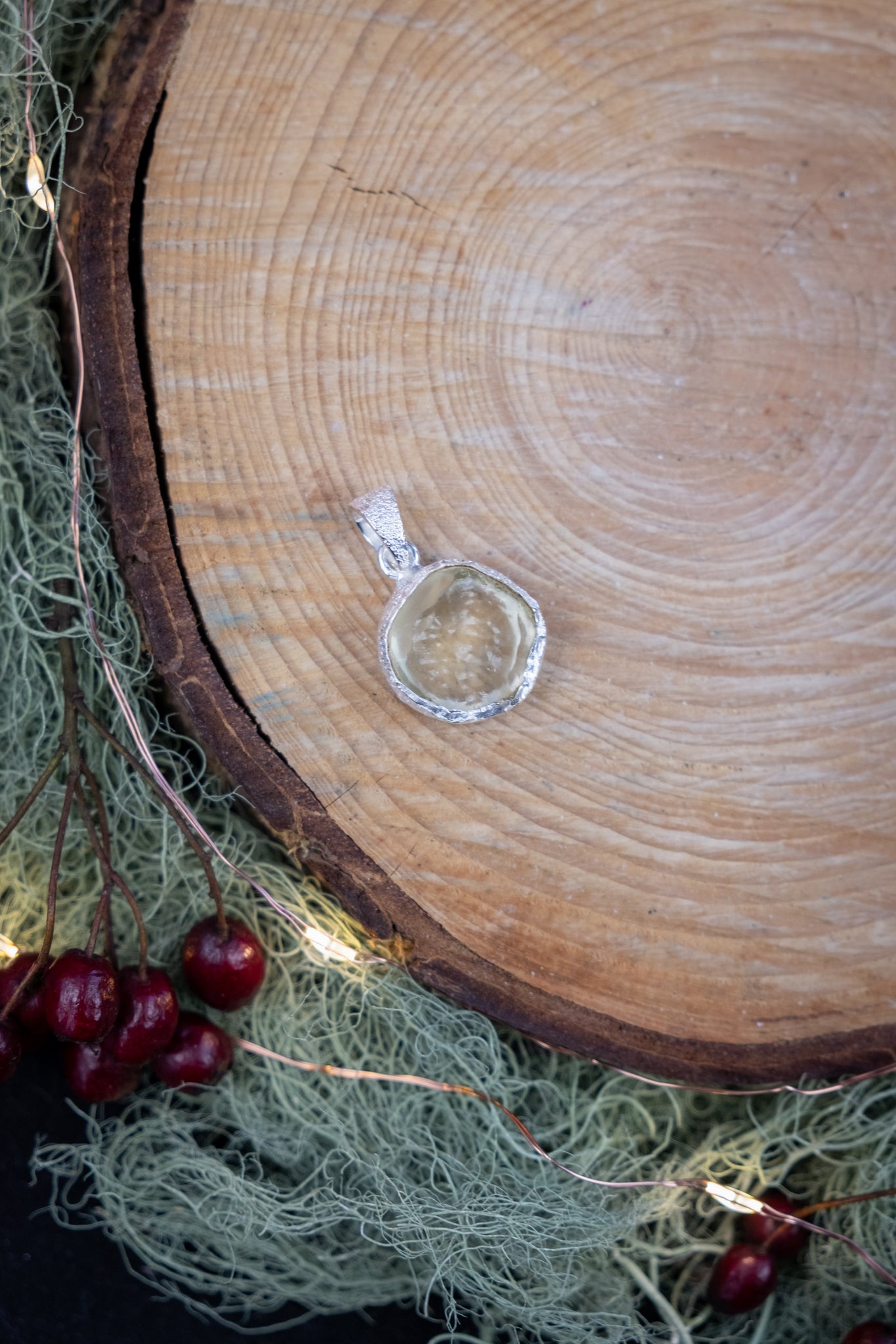 Libyan Desert Glass Pendant, Hammered Sterling Silver, Crystal Tektite Gem, High Vibration Stone, Rare Jewellery