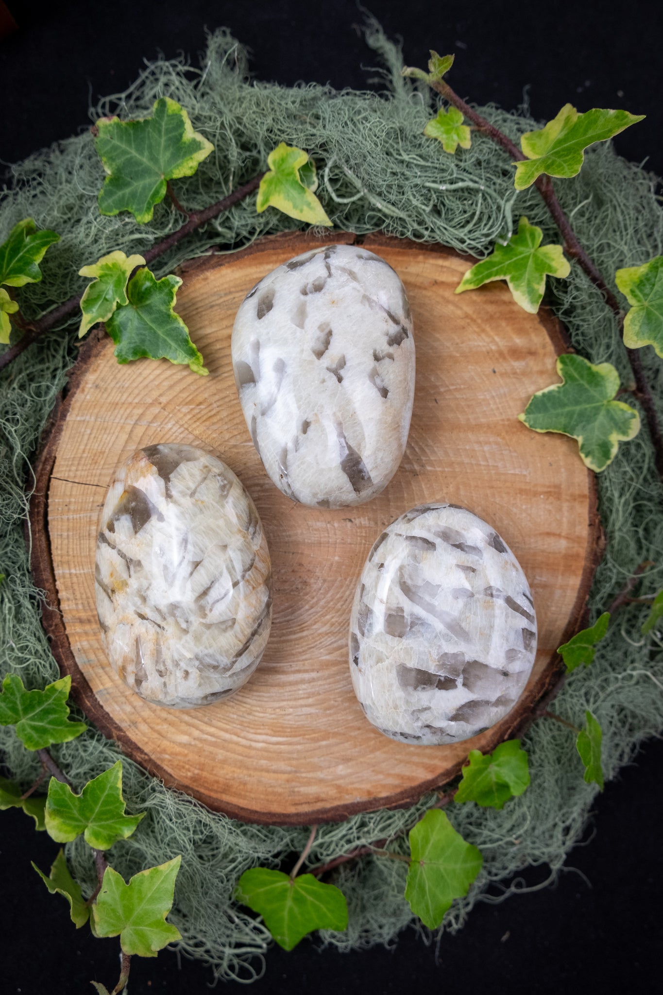High Grade Moonstone and Smokey Quartz Palms from Madagascar, rare and radiant stones for intuition grounding and emotional clarity