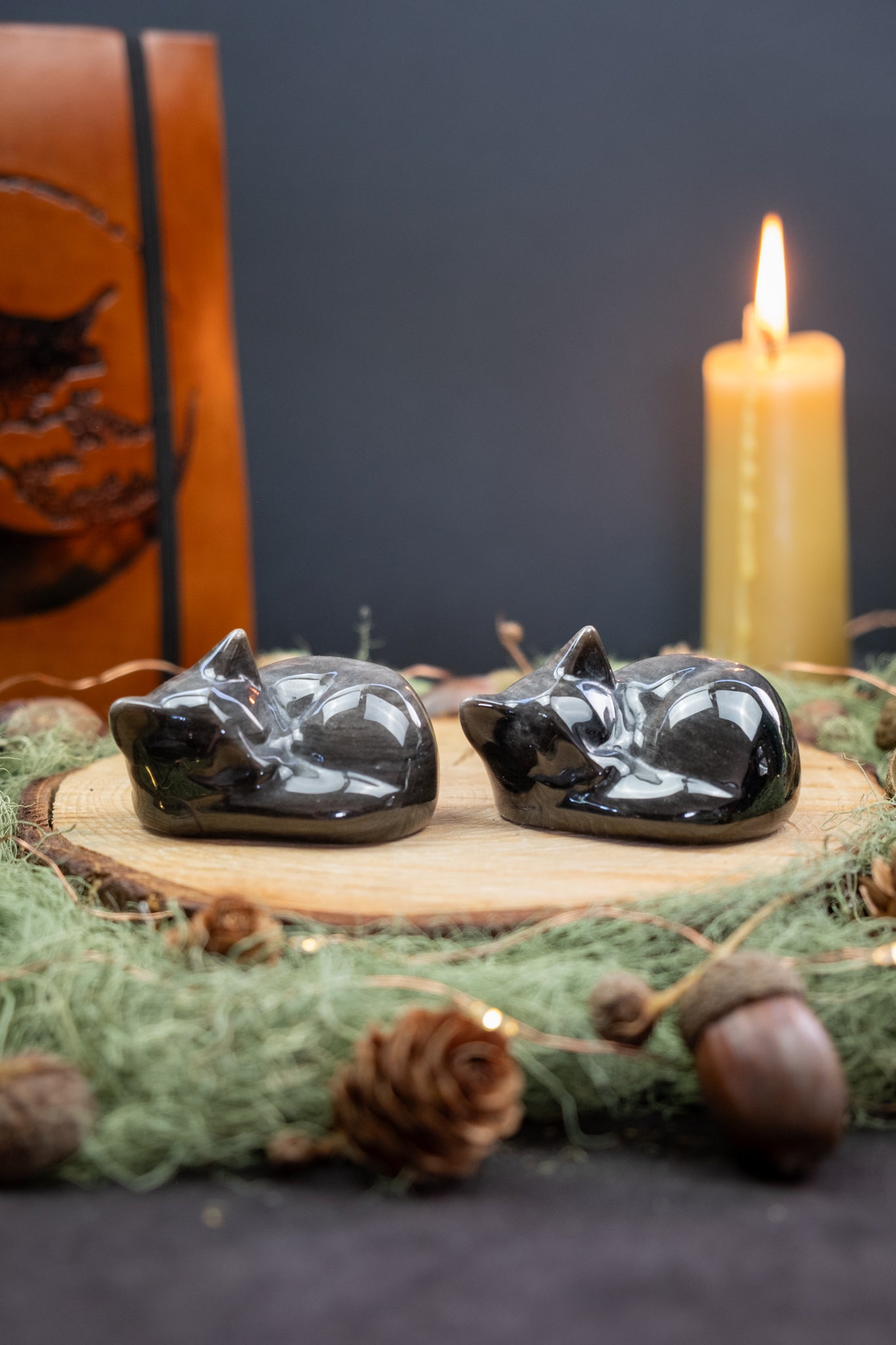 Silver Sheen Obsidian Crystal Cat, Hand Carved Gemstone for Protection, Clarity, Intuition and Grounding Energy