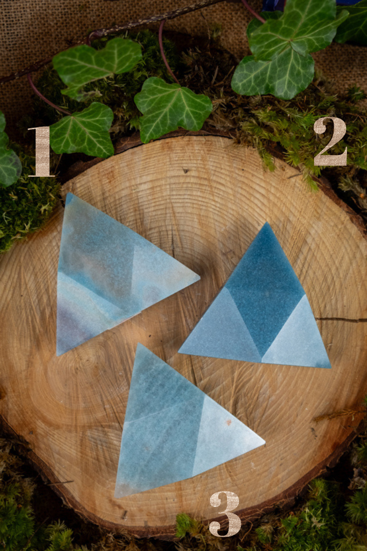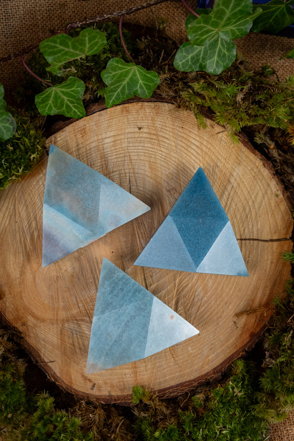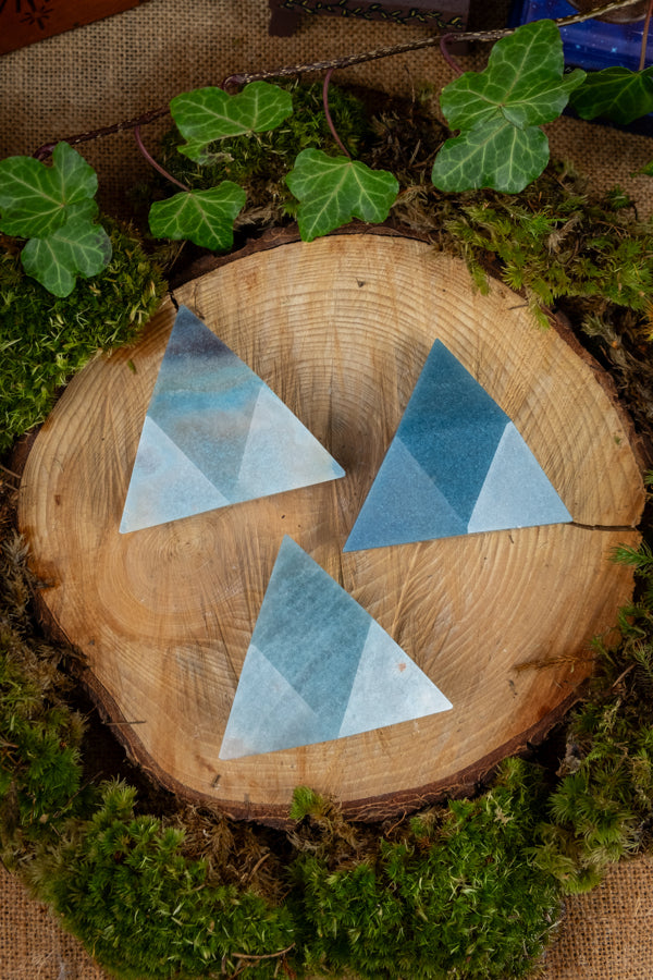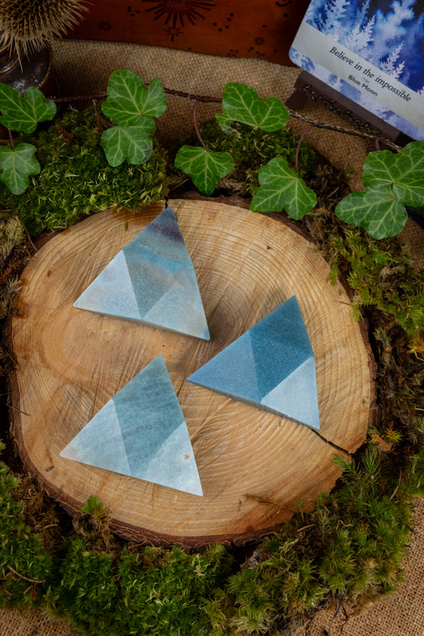 Trolleite is a rare, ascension crystal renowned for its calming blue tones and profound spiritual energy. It aids in clearing mental clutter, releasing emotional baggage, and fostering a deep connection to your higher self. When carved into a pyramid trifecta, its energy is magnified, creating a powerful focal point for transformation and clarity.